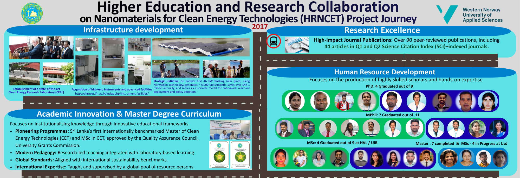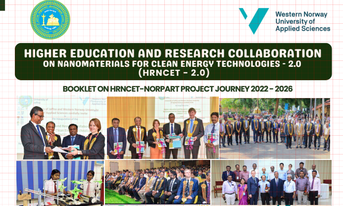 Western Norway University of Applied Sciences (HVL) and University of Jaffna (UoJ) jointly secured Norwegian Partnership Programme for Global Academic Cooperation (NORPART) Grant up to NOK 4.7 million (~ 85 million LKR) over the period of five years (2017 – 2021) under the theme of ‘Higher Education and Research collaboration on Nanomaterials for Clean Energy Technologies (HRNCET)’. Only 21 out of 114 eligible project applications have been selected for funding by Norwegian Centre for International Cooperation in Education (SIU). In addition, Royal Norwegian Embassy in Sri Lanka has funded HVL 6.2 million Norwegian Kroners (LKR 112 million) over a period of three years (2017-2019) for a project on Capacity Building and Establishment of a Research Consortium in Nanomaterials for Clean Energy Technologies.