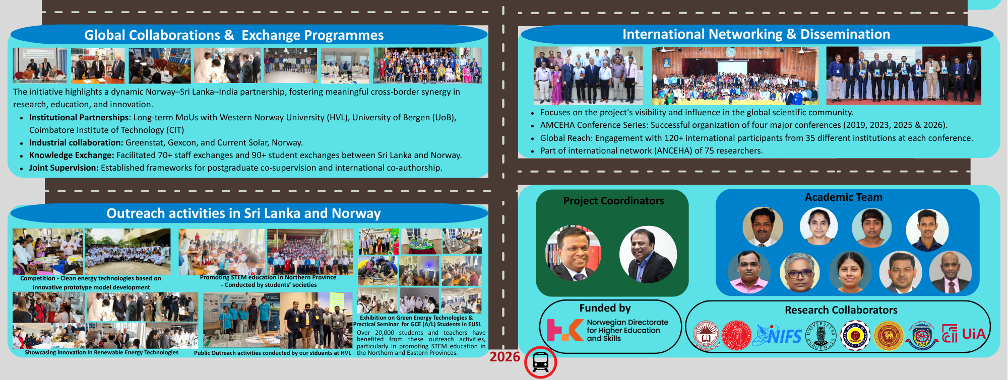 The main objective of the project is to strengthen the collaboration between the partner institutions (Western Norway University of Applied Sciences, Universities of Adger and Bergen, Norway, Coimbatore Institute of Technology (CIT), India and University of Peradeniya) in educational and research activities, and implement student and staff mobility within the field of clean energy technologies. The main objective of the project funded by the Royal Norwegian Embassy is to strengthen the existing collaboration between the partner institutions in the field of nanomaterials for energy technologies and to establish a clean energy consortium that includes private enterprises from Norway and Sri Lanka.