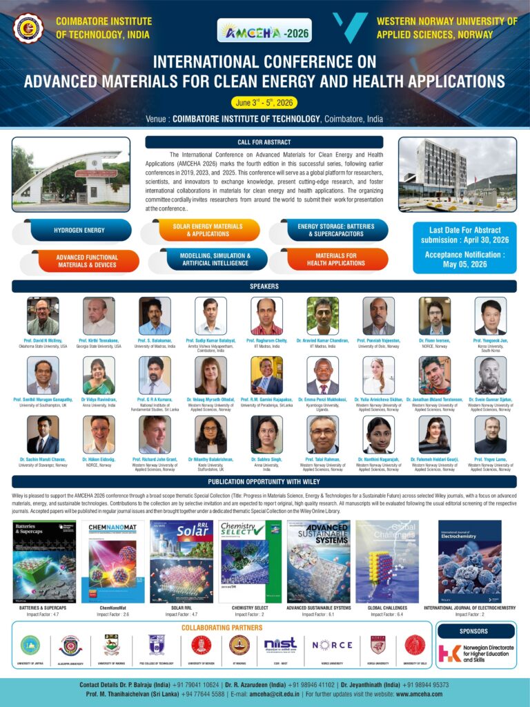 The International Conference on Advanced Materials for Clean Energy and Health Applications (AMCEHA 2026) marks the fourth edition of this successful series, following the earlier conferences held in 2019, 2023, and 2025. This conference will serve as a global platform for researchers, scientists, and innovators to exchange knowledge, present cutting-edge research, and foster international collaborations in the fields of materials for clean energy and health applications.