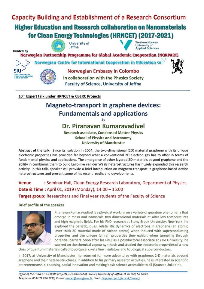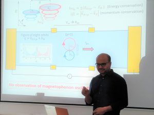 Dr. Piranavan Kumaravadivel (Research associate, Condensed Matter Physics, School of Physics and Astronomy, University of Manchester) made a talk entitled ‘Magneto-transport in graphene devices: Fundamentals and applications’ on April 01, 2019.  He provided a brief introduction on magneto-transport in graphene based device heterostructures and presented some of his recent results and developments.