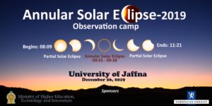 Northern Sri Lanka will witness an annular eclipse on 26th December 2019. Ancients feared solar eclipses and considered them a sign of evil to come. Yet some philosophers of antiquity and Panchangam (Hindu Calendar) understood that solar eclipses happen when the moon obscures the sun. Modern science enabled the calculation of the dates and times of eclipse occurrences to the utmost precision. Measurements conducted during solar eclipses had also unravelled many physical phenomena. A total or an annular eclipse appearing in the skies above the land you live in is regarded as a blessing. These awesome celestial events arouse curiosity and masses watching the display, who feel that “all are humbly united in front of the sun and moon”. The appearance of a total or annular solar eclipse is a rare opportunity to cultivate scientific inquisitiveness and human unity. University of Jaffna, in collaboration with University of Colombo and Western Norway University of Applied Sciences, plans to organise an eclipse observing camp in Jaffna and Killinochchi, mainly for students and conduct lectures on related astronomical topics. Plans are also made to conduct scientific measurements for research during the eclipse. These activities are co-sponsored by the Ministry of Science, Technology and Research, Sri Lanka and the HRNCET project (https://hrncet.jfn.ac.lk/).